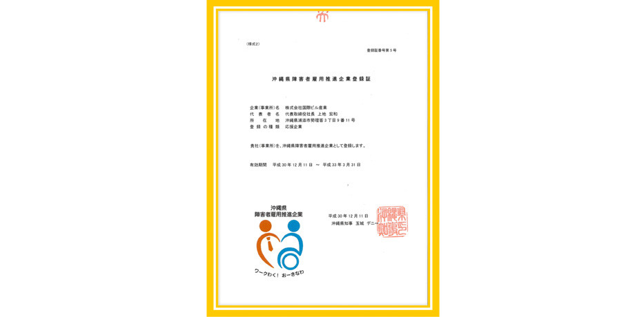 株式会社 国際ビル産業の今日までの、障害者雇用への取り組みが評価され、平成30年12月 沖縄県障害者雇用推進企業として登録されました。これからも障害者の雇用に一層の努力をしてまいります。